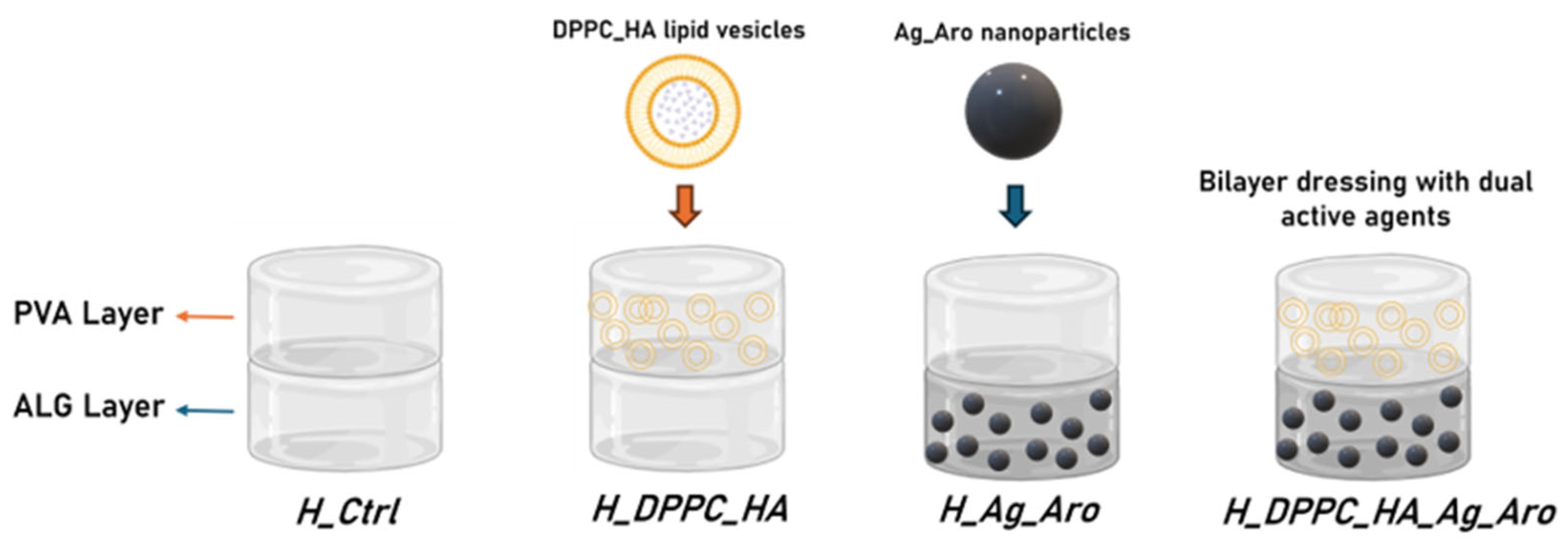 Scheme 1. Schematic representation of the four developed bilayer hydrogel dressings: H_Ctrl—PVA first layer and ALG second layer without active agents; H_DPPC_HA—PVA layer containing DPPC_HA lipid vesicles and ALG layer without active agents; H_Ag_Aro—PVA layer without active agents and ALG layer containing Ag_Aro nanoparticles; H_DPPC_HA_Ag_Aro—PVA layer containing DPPC_HA lipid vesicles and ALG layer containing Ag_Aro nanoparticles.
