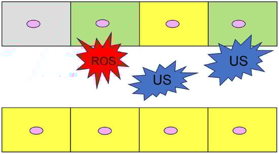 Proximal tubular epithelial (PTE) cells and mechanisms of dysfunction. Upper and lower cells form the proximal tubular walls, and the middle space is the urinary tract. Closed squares indicate PTE cells. Closed pink circles indicate cell nuclei. Closed red polygon indicates reactive oxygen species (ROS). Closed blue polygons indicate urinary stones. Yellow cells indicate the normal cells. Gray cell indicates a senescent cell. Green cells indicate cells with inflammation.