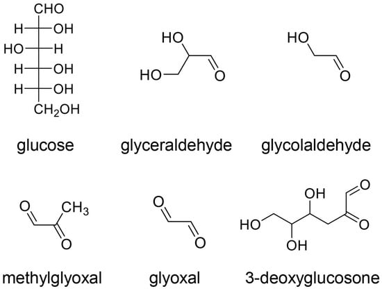 Origins of AGEs [,,,]. Glucose is a hexose, and glyceraldehyde is a triose. Glyceraldehyde, glycolaldehyde, methylglyoxal, glyoxal, and 3-deoxyglucosone can be generated from glucose via enzymatic and non-enzymatic (e.g., oxidation) reactions.