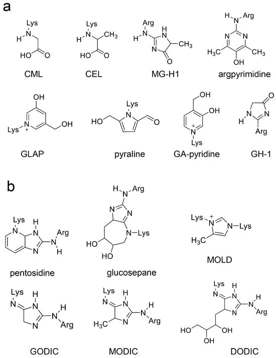 Free types of AGEs [,,,]. (a) AGEs containing one amino acid. CML, Nε-carboxymethyl-lysine; CEL, Nε-carboxyethyl-lysine; MG-H1, methylglyoxal-hydro-imidazolone; GLAP, glyceraldehyde-derived pyridinium; GH-1, glyoxal-hydro-imidazolone. (b) AGEs containing two amino acids. MOLD, methylglyoxal-derived imidazolium cross-link; GODIC, glyoxal-derived imidazolium cross-link; MODIC, methylglyoxal-derived imidazolium cross-link; DODIC, 3-deoxyglucosone-derived imidazolium cross-link.