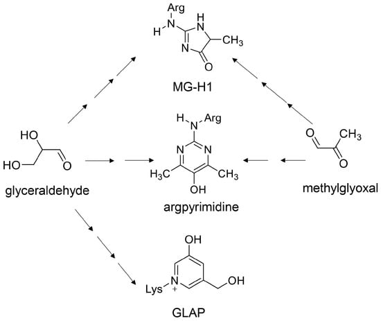 Crude AGE patterns [,,]. MG-H1, argpyrimidine, and GLAP can be generated from glyceraldehyde, though MG-H1 and argpyrimidine can also be generated from methylglyoxal. Black arrow shows a step in enzymatic/non-enzymatic reactions. MG-H1, methylglyoxal-hydro-imidazolone; GLAP, glyceraldehyde-derived pyridinium.