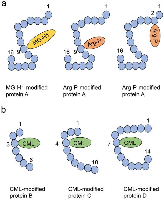 Type 1 and 2 diverse AGE patterns [,,]. Closed blue circles indicate amino acids. Black number indicates the number of amino acid residues. (a) Type 1 diverse AGE pattern. Left and middle, middle and right, and left and right protein A structures indicate type 1A, 1B, and 1C diverse AGE patterns. MG-H1, methylglyoxal-hydro-imidazolone; Arg-P, argpyrimidine. (b) Type 2 diverse AGE pattern. CML; Nε-carboxymethyl-lysine.
