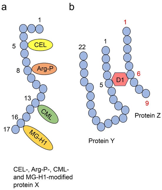Type 1 and 2 multiple AGE patterns. Closed blue circles indicate amino acids. Black or red number indicates the number of amino acid residues [,,,,]. (a) Type 1 multiple AGE pattern. CEL, Nε-carboxyethyl-lysine; Arg-P, argpyrimidine; CML, Nε-carboxymethyl-lysine; MG-H1, methylglyoxal-hydro-imidazolone. (b) Type 2 multiple AGE pattern. Proteins Y and Z are linked with D1—free AGE—involving two amino acids (the 5th amino acid residue in protein Y and the 6th amino acid residue in protein Z).