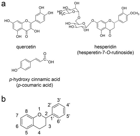 Chemical structures of study molecules. (a) Quercetin, hesperidin, and p-coumaric acid. (b) The structure of the flavonoid skeleton. Numbers indicate the location of the functional group (e.g., hydroxyl, carbonyl).