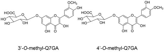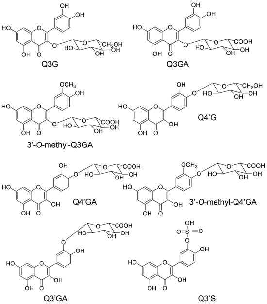 Metabolites of quercetin in the blood [,,]. Q3G, quercetin-3-O-glucoside; Q3GA, quercetin 3-O-glucuronide; 3′-O-methyl-Q3GA, 3′-O-methylquercetin-O-glucuronide; Q4′G, quercetin-4′-O-glucoside; Q4′GA, quercetin-4′-O-glucuronide; 3′-O-methyl-Q4′GA, 3′-O-methylquercetin-4-O-glucuronide; Q3′GA, quercetin-3′-glucuronide; Q3′S, quercetin-3′-O-sulfate.