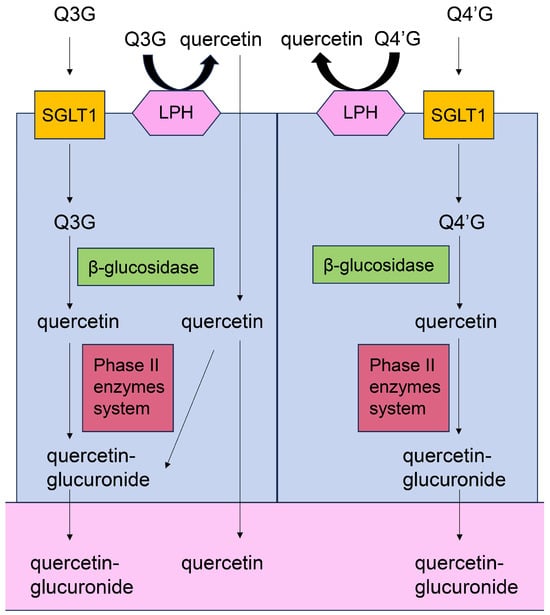 A microbalance of quercetin has been detected in human blood []. This suggests that quercetin (i) can resist various metabolic systems and (ii) maintain the aglycon structure following metabolism by various enzymes and bacteria in different organs. Various quercetin metabolites have been recorded in human blood [,,]. Although whole-metabolite profiles remain elusive, quercetin-3-O-glucoside (Q3G), quercetin 3-O-glucuronide (Q3GA), 3′-O-methylquercetin-O-glucuronide (3′-O-methyl-Q3GA), quercetin-4′-O-glucoside (Q4′G), quercetin-4′-O-glucuronide (Q4′GA), 3′-O-methylquercetin-4-O-glucuronide (3′-O-methyl-Q4′GA), quercetin-3′-glucuronide (Q3′GA), and quercetin-3′-O-sulfate (Q3S) have been reported in human blood (Figure 9) [,,]. Quercetin can be metabolized into structures such as glycosides, glucuronides, and sulfates, though mainly non-metabolized quercetin is transported into PTE cells. Q3G and Q4′G can be transported to the small intestine via SGLT1 (Figure 10) [,,]. Q3G and Q4′G are hydrolyzed via lactase phlorizin hydrolase (LPH) expressed on the membrane of small intestinal epithelial cells to produce quercetin, which can then be absorbed into PTE cells (Figure 10) [,,]. Intracellular Q3G and Q4′G are hydrolyzed by β-glucosidase to produce quercetin, which is metabolized to glucuronide via phase II enzyme systems (Figure 10) []. Although little is known of quercetin-glucuronides, Q3GA, 3′-O-methyl-Q3GA, Q4′GA, 3′-O-methyl-Q4′GA, and Q3′GA may be produced in this step. Quercetin-glucuronides are dispersed into the lymph fluid and blood from the large intestine epithelial and hepatic parenchymal cells []. Quercetin-glucosides are transported from the small intestine into the large intestine, where bacteria hydrolyze them to produce quercetin [,]. The transport potential of quercetin has been confirmed in human colon Caco-2 cells (Figure 11) [,,]. Murota et al. [] reported that Q3G and Q4′G were likely absorbed into Caco-2 cells via SGLT1 as the transporter (Figure 11). In the large intestine, glucuronide-quercetins may be produced via β-galactosidase and phase II enzymes, and subsequently leak into lymph fluid and blood. We assessed the hepatic metabolism of quercetin [,,,,]. Quercetin has been shown to protect against fibrosis and lipogenesis in hepatic tissue [,]. Kaci et al. [] predicted that G3S may be produced as a metabolite. Hou et al. [] suggested that quercetin metabolites may protect hepatic cells. Michala et al. [] detected 3′-O-methylquercetin-7-O-glucuronide (3′-O-methyl-Q7GA) and 4′-O-methylquercetin-7-O-glucuronide in human hepatic parenchymal HepG2 cells treated with quercetin (4′-O-methyl-Q7GA) (Figure 12).