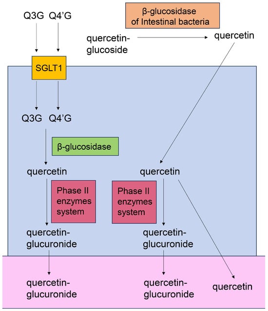 Model of Q3G, Q4′G, and quercetin absorption into the large intestine, and leaking of quercetin-glucuronide and quercetin into the blood or lymph vessels [,,,,]. Closed blue square indicates large-intestinal epithelial cells. Open pink area indicates blood or lymph vessel. Closed orange square indicates β-glucosidase of internal bacteria. Closed yellow square indicates sodium-glucose cotransporter 1 (SGLT1). Closed green square indicates cytosolic β-glucosidase. Closed red square indicates phase II enzyme system. Q3G, quercetin-3-O-glucoside; Q4′GA, quercetin-4′-O-glucuronide.