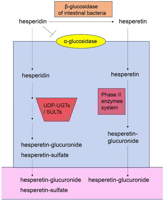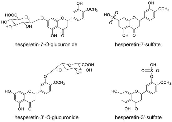 Hesperidin has never been recorded in the blood of humans, rats, or mice, suggesting that it cannot escape metabolism. Although hesperidin cannot be hydrolyzed by α-glucosidase in the small/large intestine, it can be hydrolyzed to hesperetin by bacterial β-glucosidase and absorbed into the small/large intestine (Figure 13) []. Hesperetin in the small/large intestine can be metabolized via the phase II enzyme system to hesperetin-glucuronide. Hesperidin can be transported into the small [,] and large intestine (Figure 13) [,]. Brand et al. [] reported that UDP-glucuronosyltransferases (UGTs) and sulfotransferases (SULTs) in the human small/large intestines and liver can metabolize hesperidin. In the cytosolic fractions of these tissues, hesperetin-3′-O-glucuronide, hesperetin-7′-O-glucuronide, hesperetin-3′-O-sulfate, and hesperetin-7′-O-sulfate were identified following incubation with hesperidin (Figure 14) [,]. Hesperidin has been recorded in the liver of animal models, and its metabolites in a liver with fatty-liver characteristics suppressed inflammation and fibrosis [,]. In human hepatic parenchymal Hepa-RG and stellate LX-2 cells, hesperidin exerted antioxidant effects by increasing the protein levels of copper/zinc superoxide dismutase (SOD1), manganese superoxide dismutase (SOD2), and catalase, and by suppressing lipid oxidation []. These effects may have been associated with the anti-lipidation activities of its metabolites.