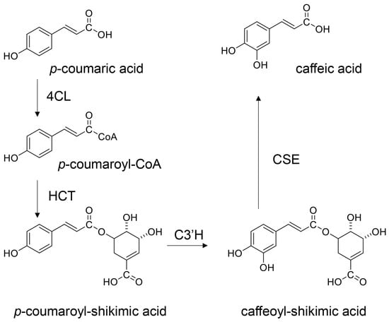 Metabolic pathway of p-coumaric acid in plants [,]. 4CL, 4-coumaric CoA-ligase; HCT, hydroxycinnamoyl transferase; C3′H, p-coumaroyl-shikimic acid-3-hydroxytransferase; CSE, caffeoyl shikimic esterase.