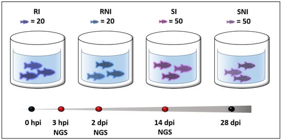 Experimental setup (RI, resistant infected fish; RNI, resistant non-infected fish; SI, susceptible infected fish; SNI, susceptible non-infected fish; hpi, hours post infection; dpi, days post infection; NGS, next-generation sequencing).