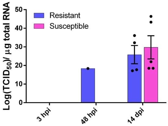 Three time points were selected for analysis, in an attempt to gain a better understanding of the viral infection dynamics in resistant and susceptible sea bass. The time points were selected based on our previous study [], where it was found that immune gene modulation was evident at 3 hpi, which was designated as the early infection time point. The 2 dpi (48 hpi) time point was selected as the second time point, since at that point the host immune response seems to reach a stabilized level of gene expression. The final time point was set at 14 dpi, since that was found to be a key time point for the establishment of a virus carrier state in the host []. At the initial time point, no viral load was detected in both families. Two days later (2 dpi), only one fish belonging to the resistant sea bass group had a detectable viral load, even though the clinical signs had appeared and a death had occurred in the susceptible fish. At the 14 dpi time point, both families showed a considerable amount of replicated virus in the brain, which is the virus’ target organ, with similar levels, but the fish did not show any clinical signs of the disease. This observation is in agreement with previous independent studies [], confirming that virus-resistant fish are actively infected; therefore, genetic resistance mechanism cannot be entirely based on the virus’ inability to infect the host.