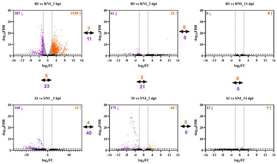 Volcano plots of gene expression response in resistant and susceptible families following NNV challenge. Volcano plots of the log2 fold change (FC) vs. log10 false discovery rate (FDR) of every transcript for each of the six comparisons are shown. The significantly up-regulated genes in each comparison (log2FC > 2, FDR > 0.05) are shown in orange, while the significantly down-regulated genes in each comparison (log2FC < −2, FDR > 0.05) are shown in purple. The black dots depict all genes with FDR < 0.05 and the grey dots represent all genes with −2 < log2FC < 2 and FDR > 0.05. The dashed lines correspond to log2FC = −2 or 2, and FDR = 0.05. The numbers of significant up-regulated (orange) and down-regulated (purple) transcripts for each comparison are shown in the corners of each volcano plot. The numbers of common significant down-regulated and up-regulated genes between the two families at each time point are shown in the in the middle of the figure, i.e., below the RI vs. RNI and above the SI vs. SNI volcano plots (NNV, nervous necrosis virus; RI, resistant infected fish; RNI, resistant non-infected fish; SI, susceptible infected fish; SNI, susceptible non-infected fish; hpi, hours post infection; dpi, days post infection).