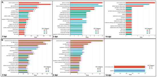 The top 20 gene ontology (GO)-enriched terms in the RI vs. RNI groups: (A) Up-regulated and (B) down-regulated DEGs. BP, biological process; MF, molecular function; CC, cellular component; RI, resistant infected fish; RNI, resistant non-infected fish; hpi, hours post infection; dpi, days post infection.