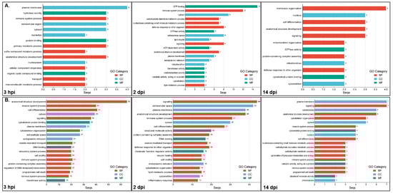 The results of the functional enrichment analyses (adj. p < 0.05) between the susceptible infected (SI) and non-infected NNV (SNI) experimental groups at the 3 hpi, 2 and 14 dpi time points are listed in Table S4, and the top 20 GOs are shown in Figure 5. For the up-regulated DEGs (Figure 5A), the most enriched category at all time points was the biological process (3 hpi, 7/15; 2 dpi, 13/32; 14 dpi, 7/12), followed by the cellular component (3 hpi, 5/15; 2 dpi, 9/32; 14 dpi, 3/12) and the molecular function (3 hpi, 3/15; 2 dpi, 10/32; 14 dpi, 2/12) categories. For the down-regulated DEGs, the GOs resulting from enrichment analysis are listed in Table S5, and the top 20 GOs are shown in Figure 5B. The most enriched category in all cases was the biological process (3 hpi, 41/75; 2 dpi, 43/74; 14 dpi, 17/31), followed by the molecular function (3 hpi, 20/75; 2 dpi, 16/74; 14 dpi, 7/31) and the cellular component (3 hpi, 14/75; 2 dpi, 15/74; 14 dpi, 7/31) categories.