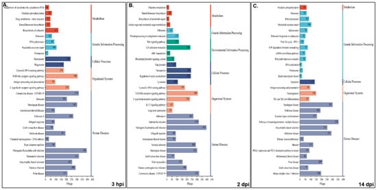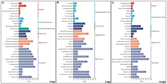 The results enriched pathway categories analysis between the SI vs. SNI experimental groups at the 3 hpi, 2 and 14 dpi time points are summarized in Table 2 and analyzed in Table S7, and the top 30 pathways are shown in Figure 7.