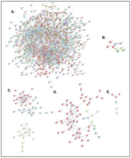 Protein–protein interaction (PPI) networks, with k-means clustering for the zebrafish orthologs of the differentially expressed genes in D. labrax (A) RI vs. RNI groups 3 hpi; (B) RI vs. RNI groups 2 hpi; (C) SI vs. SNI groups 3 hpi; (D) SI vs. SNI groups 2 dpi, and (E) SI vs. SNI groups 14 dpi. It is retrieved via API access to the STRING database (https://string-db.org) (accessed on 24 April 2025) and was performed based on the Danio rerio protein database. Each colored group represents a different cluster. The edges represent protein–protein interactions.