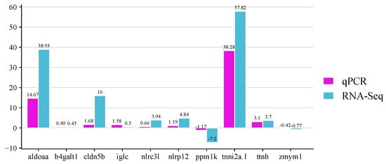 Validation of the RNA-Seq results by qPCR. Aldoaa, fructose-bisphosphate aldolase a; b4galt1, beta-galactosyltransferase 1-like; cldn5b, claudin-5-like; iglc, immunoglobulin light chain; nlrc3l, protein nlrc3-like; nlrp12, lrr and pyd domains-containing protein 12-like; ppm1k, protein phosphatase mitochondrial-like; tnni2a.1, troponin fast; ttnh, novel protein titin; zmym1, zinc finger mym-type protein 1-like.