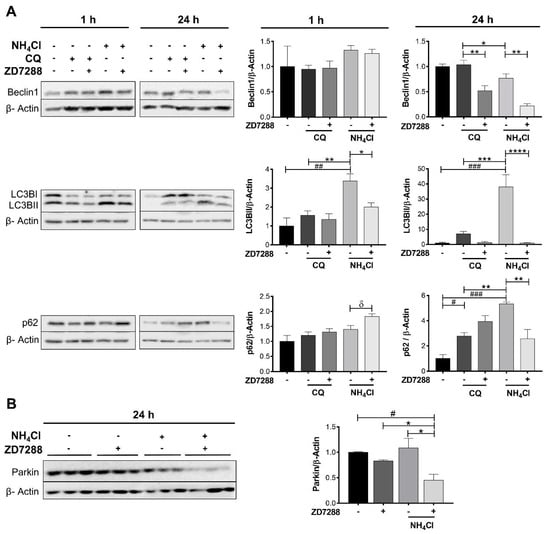 Effect of ZD7288 on mitophagy with chloroquine (CQ) or NH4Cl-induced acidosis after 1 and 24 h. (A) Immunoblotting of Beclin1, LC3B, p62, and (B) Parkin from total homogenates of NRK-52E cells exposed to ZD7288 (50 µM) for 1 h or 24 h. Graphs show the densitometric analysis normalized to β-Actin (loading control) and the control group. Data are represented as the mean ± SEM (n = 3). Ordinary one-way ANOVA, # compared to the control group (Dunnett’s post hoc test) # p < 0.05, ## p < 0.01, ### p < 0.001; * comparison between preselected groups (Sidak’s post hoc test) * p < 0.05, ** p < 0.01, *** p < 0.001, **** p < 0.0001; δ Unpaired Student’s t-test, δ p< 0.05.