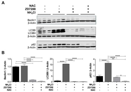 ZD7288-induced autophagy in acidosis is mediated by a ROS-independent pathway. (A) Immunoblotting of Beclin1, LC3B, and p62 from total homogenates of NRK-52E cells subjected to NH4Cl-induced acidosis, ZD7288 (50 µM), and N-acetylcysteine (NAC; 10 mM) for 24 h. (B) Graphs show the densitometric analysis normalized to β-Actin (loading control) and the control group. Data shown in triplicate are represented graphically as the mean ± SEM. Ordinary one-way ANOVA, followed by Newman–Keuls multiple comparisons post hoc test, * p < 0.05, ** p < 0.01, **** p < 0.0001.