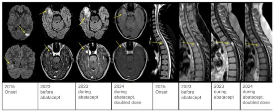 Six months after initiating targeted therapy, control brain and spine MRI showed worsening lesions (Figure 1), and diarrhea and exertional dyspnea persisted. However, clinical evaluation revealed no signs of spinal cord dysfunction, and somatosensory evoked potentials were within normal range, confirming a clinical–radiological dissociation of disease activity. Consequently, the frequency of abatacept infusions was doubled. Reevaluation with MRI three months later demonstrated improvement and no new lesions (Figure 1). Gastrointestinal and pulmonary symptoms also improved. At the last follow-up, the patient reported good tolerability, improved quality of life, and perceived well-controlled disease. Last immunological tests are reported in Supplementary Table S1.