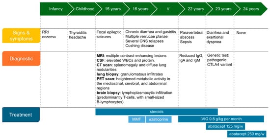 Overview of clinical history and management. Abbreviations: RRI: recurrent respiratory infections, CNS: central nervous system, WBC: white blood cells, MMF: mycophenolate mofetil 600 mg/m2 bid; azathioprine 2 mg/kg orally per day; IVIG: intravenous immunoglobulins.