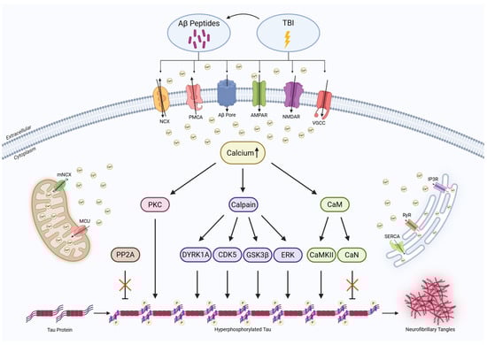 TBI- and Aβ-induced calcium dysregulation activates calcium-dependent signaling cascades that promote tau hyperphosphorylation and NFT formation. Excess calcium influx from the extracellular space and increased release from intracellular stores (ER and mitochondria) cause sustained cytosolic calcium elevation. This overload activates kinases (PKC, DYRK1A, CDK5, GSK3β, ERK, CaMKII), proteases (calpains), and co-factors (CaM), while impairing phosphatases (PP2A, CaN), thereby shifting the balance towards phosphorylation. This enzymatic imbalance promotes tau hyperphosphorylation, detachment, misfolding, aggregation, and ultimately NFT formation. Black arrows indicate a potential activation pattern of the interconnected enzyme network triggered by calcium dysregulation, whereas red crosses denote loss of physiological dephosphorylation capacity. Labeled calcium-signaling proteins mediate cytosolic calcium overload, with black arrows indicating the physiological direction of calcium transport. Created with BioRender.com (https://www.biorender.com, accessed on 20 August 2025).