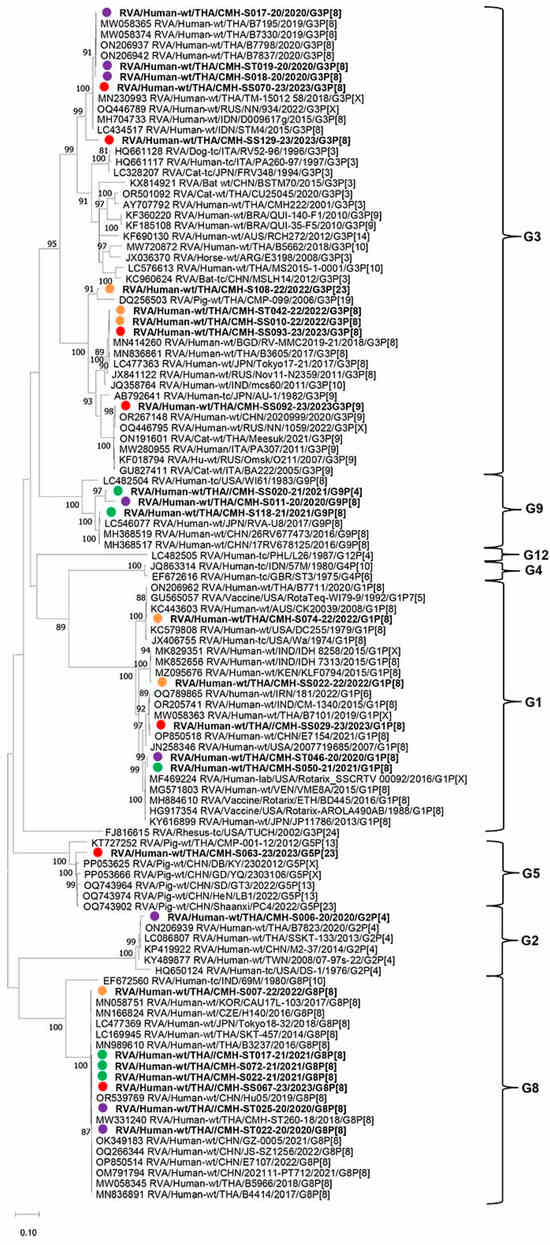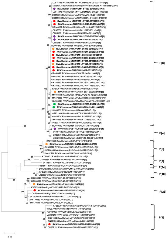 4.3. RVA G- and P-Genotyping, Nucleotide Sequencing, and Phylogenetic Analysis
