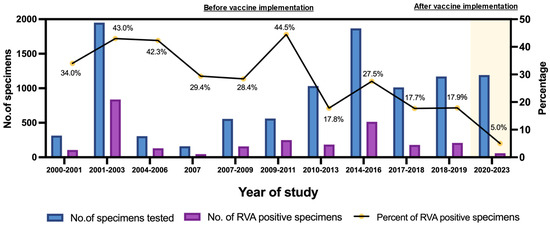 | Year | Number of Specimen Tested | Number of RVA-Positive Specimens (%) |