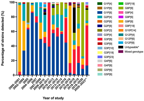 | Rotavirus A Genotype | Number of Rotavirus A Strains (%) | ||||