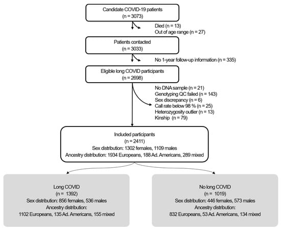 - Lammi, V.; Nakanishi, T.; Jones, S.E.; Andrews, S.J.; Karjalainen, J.; Cortés, B.; O’Brien, H.E.; Ochoa-Guzman, A.; Fulton-Howard, B.E.; Broberg, M.; et al. Genome-Wide Association Study of Long COVID. Nat. Genet. 2025, 57, 1402–1417. [Google Scholar] [CrossRef]
