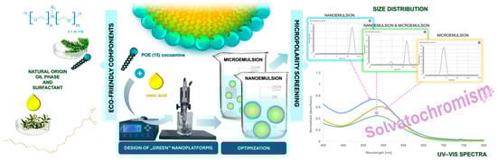 In this manuscript, we present two biocompatible submicron emulsion dispersions: cosurfactant-free microemulsions and nanoemulsions obtained via self-assembly processes with enhanced stability. Both formulations were designed with the inspiration of green chemistry and according to sustainable development principles, alongside achieving low production costs and sustaining high stability. Their high safety might be profitably used in the cosmetic, pharmaceutical, nutriceutical, and nanomedicine fields, opening up new possibilities for product development. Moreover, we propose a novel procedure to optimize and distinguish preliminarily emulsion-type systems as well as to evaluate the polarity of oils and a newly synthesized solvatochromic probe—5-Dimethylamino-5′-nitro-2,2′-bithiophene (DNBT)— using UV–Vis spectroscopy. DNBT is a solvatochromic dye, the so-called Effenberger probe in the literature data []. Due to its particular importance, especially in the context of the solvatochromic phenomenon, DNBT has been studied most thoroughly both experimentally and with quantum chemical simulations [,,,,,,]. The energy required to excite the molecule decreases through the more favorable interactions with polar solvent molecules, resulting in a smaller energy gap. Consequently, the excited state is better stabilized than the ground one, resulting in the bathochromic spectrum shifts (positive solvatochromism) as the solvent’s polarity increases []. Although this probe has been partially tested in various solvents, it has not yet been applied to assess micropolarity in more complex systems []. Due to its prominent properties and broad application potential, many chromophores inspired by this probe are currently being designed [,]. The schematic representation of the investigation into green nanoplatform design and the application of the solvatochromic approach is shown in Figure 1.
