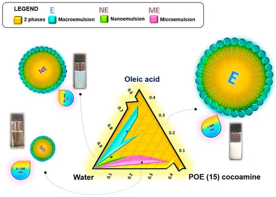 For examination, the phase behavior of the system consisted of polyoxyethylene (15) cocoamine used as a surfactant (S), oleic acid applied as an oil phase (O), and distilled water (W), a pseudoternary diagram was constructed by an aqueous titration–ultrasound method. Water was added stepwise to the previously weighed surfactant–oil mixture (SOR ratios of 9:1, 8:2, 7:3, 6:4, 5:5, 4:6, 3:7, 2:8, and 1:9, respectively). The amount of aqueous phase introduced was adjusted to achieve a water concentration of 5% to 99% of the total volume at approximately 5% intervals. After each part, the samples were mixed and then placed in thermostated tubs at a constant temperature of 20 °C for 2 min to equilibrate. The phase boundaries correspond to identical distances between subsequent experimental observations on both sides of the phase boundary. Visual observations were conducted after each 5% addition of the aqueous phase to the oil–surfactant mixture and subsequent equilibration. Visual observations resulted in the following categories: (I) transparent—oil-in-water (o/w) microemulsion (ME); (II) translucent with a blue sheen—oil-in-water (o/w) nanoemulsion (NE); (III) milky or cloudy—emulsion (E); (IV) two separate phases (2Ph).