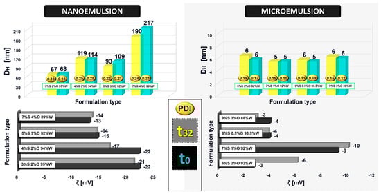Differences in stability between the respective formulations were investigated. The stability process was evaluated by leaving the samples in a dark place at 25 °C. The behavior of micro- and nanoemulsion systems after preparation (t0) and over one month (t32) left at room temperature is shown in Figure 3. The PdI is a parameter related to the monodispersity of the formulation. In technological applications and industrial scale-up during production, it is highly relevant that the formulation will be homogeneous as this affects its customizability properties. As shown in Figure 3, all the presented compositions are characterized by high homogeneity and uniform size, having a narrow size distribution (PdI < 0.3). Moreover, the microemulsions are characterized by an ultra-low polydispersity index (for example, in the case of the 9%S 0.5%O 90.5%W formulation, the PdI is 0.09) so there should be no issue when scaling up during processing, and highly homogeneous nanocarriers will be achieved [].
