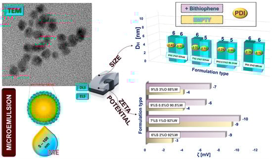 Hydrodynamic diameter (DH) and zeta potential values for the investigated microemulsion systems for empty nanocarriers and with cargo (bithiophene). Image made with a transmission electron microscope (TEM) showing the morphology and high uniformity of microemulsion droplets (empty 9%S 0.5% O 90.5%W formulation). Scale bar represents 20 nm.