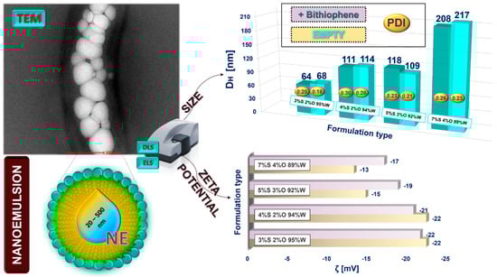 Hydrodynamic diameter (DH) and zeta potential values for the investigated nanoemulsion systems for empty nanocarriers and with cargo (bithiophene). Image made with a transmission electron microscope (TEM) showing the morphology and high uniformity of nanoemulsion droplets (empty 7%S 4% O 89%W formulation). Scale bar represents 500 nm.