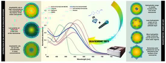 The process parameters (homogenization time, cycle, amplitude, etc.) and formulation composition (type of surfactant, oil phase, and the ratio between components) can be readjusted to achieve the most desirable physicochemical characteristics for the target application of interest. Employing solvatochromic dyes to monitor the internal environment can also help optimize drug delivery systems for various applications. This approach can be applied in several ways—such as to monitor the microenvironment inside a variety of nanocarriers (for the evaluation of whether the interior of the nanoplatform is a suitable environment for solubilization of the chosen bioactive agent depending on its hydrophobicity); in addition, it can be used to assess the integrity and stability of nanocarriers by monitoring solvatochromic shifts (if some instability occurs, then the spectrum will be shifted towards more nonpolar solvents). Another appealing way to possibly apply a solvatochromic probe and UV–Vis spectroscopy is to potentially indirectly distinguish micro- and nanoemulsions from each other at the condition that both types of colloidal dispersions could be formed using the same surfactant and oil phase. That is due to solvatochromic probes being extremely sensitive to micropolarity changes []. Since a UV–Vis spectrophotometer is easily accessible in almost every laboratory, this approach can potentially be applied as an alternative to other meticulous ways of improving and optimizing the fabrication process.