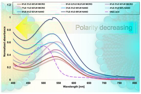 Shifts in the UV–Vis spectra between the different micellar types were noted, as shown in Figure 7. The maxima of the wavelengths are presented in Table S1 in the Supplementary Materials. At the same time, a tendency to localize at wavelengths characteristic of a specific formulation type is evident (all nanoemulsions localize at similar wavelengths, as do microemulsions). Nanoemulsions were most shifted toward shorter wavelengths (λmax = +63 to +67 nm relative to hexane), probably as a result of their highest oil phase content. The environment inside the nanoemulsions mimicked the polarity prevailing in solvents as methanol (λmax = 530 nm), acetone (λmax = 531 nm), chloroform (λmax = 533 nm), and dichloromethane (λmax = 535 nm). Remarkably, it is not the percentage of oil phase in the formulation that is important but the ratio between the amount of surfactant and oil. In microemulsion formulations, more surfactant is needed relative to oil than in nanoemulsions; however, at the same time, in the case of the 4%S 2%O 94%W composition, the size distribution showed two subpopulations in terms of size—in addition to the peak at the nanoemulsion, a smaller peak in terms of the droplet size appeared (shown on Figure 1) and this was also noticed by a bathochromic shift. While comparing the 3%S 2%O 95%W and 4%S 2%O 94%W formulations, it can be perceived that increasing the amount of surfactant and leaving the oil concentration constant can cause a red shift by λmax = +4 nm (530 → 534 nm). The absorption spectra of both 3%S 2%O 95%W and 7%S 4%O 89%W (both are nanoemulsion formulations) localize at approximately the same wavelength (530 nm and 531 nm, respectively). In the case of microemulsions, leaving the surfactant content at the same level but reducing the oil concentration of the formulation can substantially affect shifts toward longer wavelengths. Considering the formulations 9%S 3%O 88%W and 9%S 0.5%O 90.5%W, a noticeable bathochromic shift by λmax = +6 nm (538 → 544 nm) can be perceived. On the other hand, the polarity is approximate to N,N-dimethyl formamide (λmax = 549 nm). This may indicate a slightly different microenvironment inside these nanocarriers. The use of oleic acid seems to play a significant role as the oil molecules may localize not in the core of the nanocarrier but penetrate further into the palisade layer, depending on the oil’s concentration and character (amphiphilic) []. This penetration potentially leads to a more polar microenvironment inside the nanocarrier, and it is mainly observable in microemulsion formulations, probably due to the lower concentration of the oil phase and the smaller size of these nanoplatforms []. This indicates the sensitivity of this method to detect even the most subtle changes in micellar systems. The obtained results are as reasonable as can be expected given the physicochemical differences between the two emulsion types.