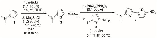 The DNBT dye (4) was synthesized in a two-step reaction sequence according to the modified procedure (Scheme 1) []. In the first stage, the 2-(dimethylamino) thiophene 1 was lithiated with n-BuLi at room temperature, followed by transmetalation with trimethyltin chloride at −70 °C to give the organotin compound 2. The latter was used in the second reaction step and coupled at 60 °C with the 2-iodo-5-nitrothiophene 3 under PdCl2 (PPh3)2 catalysis to yield the desired bithiophene 4 with 67% yield as dark red-purplish solid. The structure of the DNBT dye (4) was fully confirmed by standard spectroscopic techniques, and the obtained data were in full agreement with the previously reported literature data [].1H NMR δH (300 MHz, CDCl3): 3.01 (s, 6H), 5.81 (d, J = 4.2 Hz, 1H), 6.73 (d, J = 4.4 Hz, 1H), 7.14 (d, 1 J = 4.3 Hz, 1H), 7.76 (d, J = 4.5 Hz, 1H). Mp (°C) 176–178 (lit. [] 177–178). The related 1H NMR δH (300 MHz, CDCl3) spectra are included in the Supplementary Materials (Figure S4).