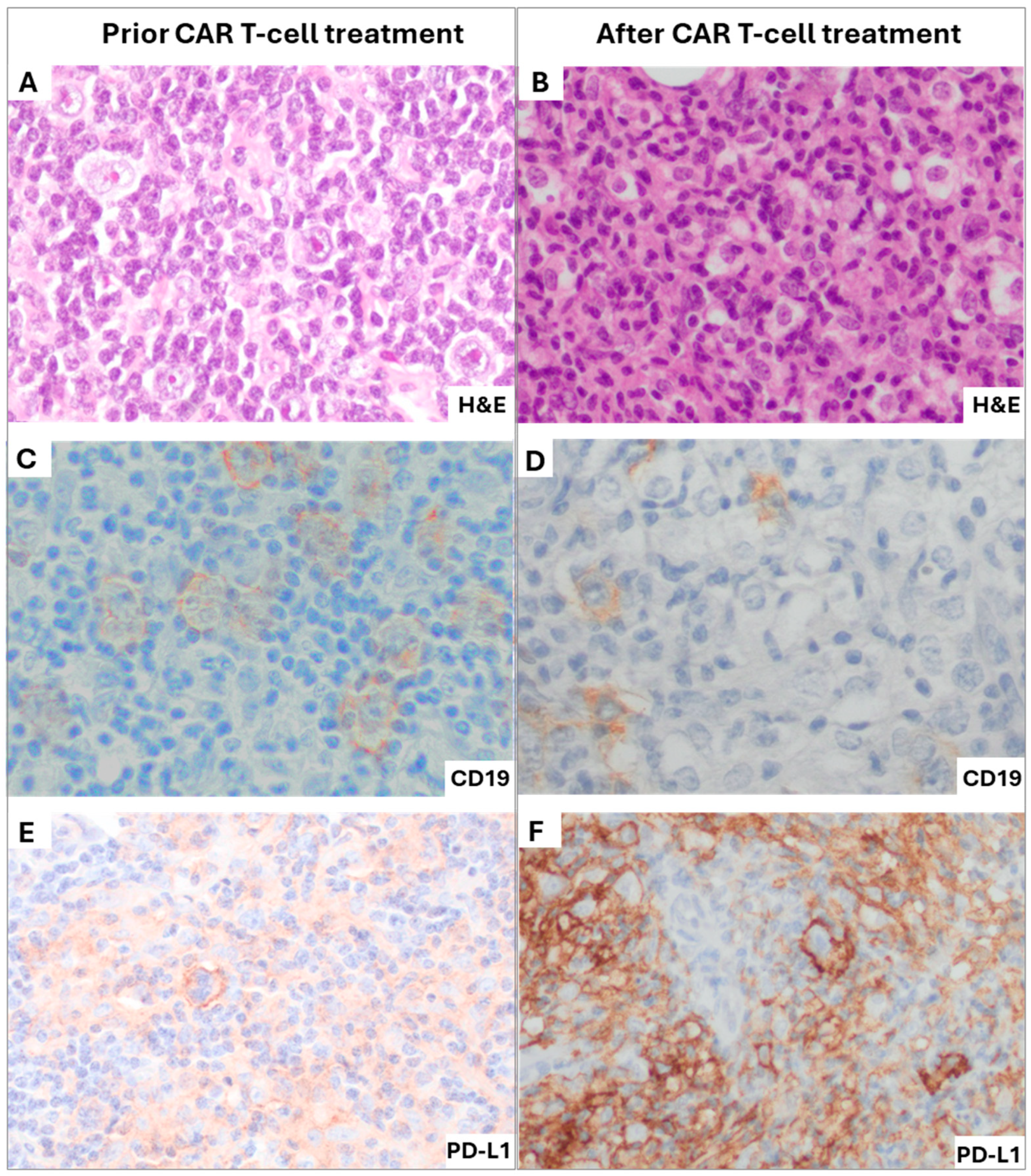 - Pophali, P.A.; Fein, J.A.; Ahn, K.W.; Allbee-Johnson, M.; Ahmed, N.; Awan, F.T.; Farhan, S.; Grover, N.S.; Hilal, T.; Iqbal, M.; et al. CD19-directed CART therapy for T-cell/histiocyte–rich large B-cell lymphoma. Blood Adv. 2024, 8, 5290–5296. [Google Scholar] [CrossRef] [PubMed]