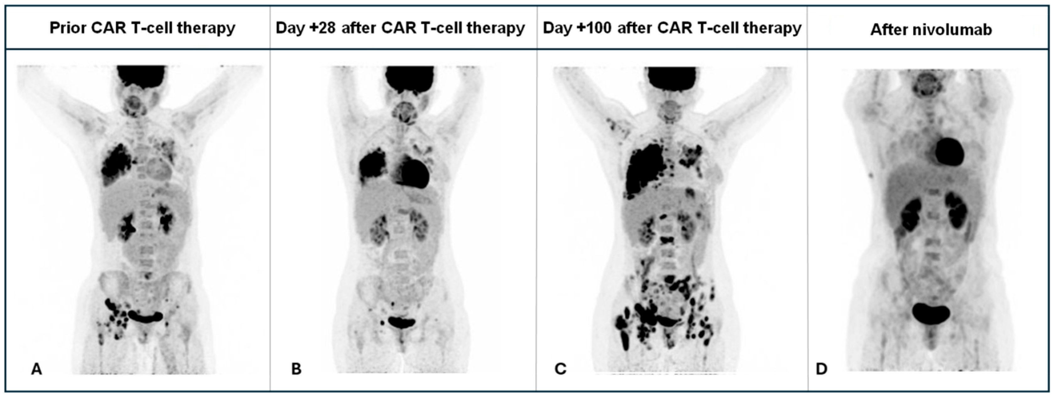 Chicago/Turabian StyleMunarriz, Daniel, Oriana López-Godino, Nuria Martinez-Cibrian, Nil Albiol, Helena Brillembourg, Sergio Navarro-Velázquez, Marta Español-Rego, Sebastián Casanueva, Lucía García-Tomás, Guillermo Muñoz-Sanchez, and et al. 2025. "Combining CAR T-Cell Therapy and Nivolumab to Overcome Immune Resistance in THRLBCL: A Case Report" International Journal of Molecular Sciences 26, no. 19: 9265. https://doi.org/10.3390/ijms26199265