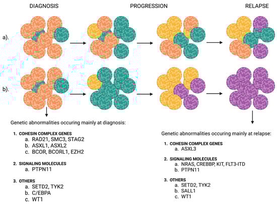 Models of clonal evolution in AML and mutations in specific gene families typical during clonal evolution. (a) Linear evolution describes the sequential acquisition of mutations. The relapse-originating cell is part of the major clone at diagnosis. (b) Branching evolution describes the eradication of the major clone and subsequent outgrowth of a secondary clone. The relapse-originating cell is part of a subclone at diagnosis. Created in https://BioRender.com, accessed 16 July 2025.