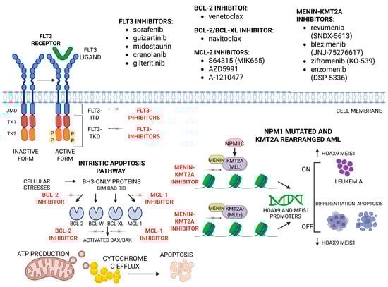 Mechanisms of action of FLT3 inhibitors, BCL2 inhibitors, and menin-KMT2A inhibitors. Created at https://BioRender.com, accessed 16 July 2025.