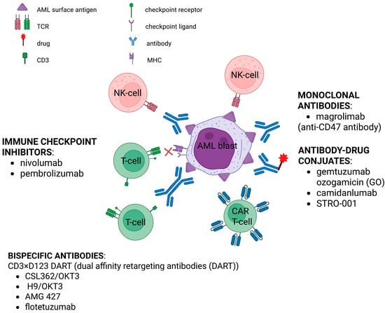 Immunotherapeutic approaches to AML. Created at https://BioRender.com, accessed 16 July 2025.