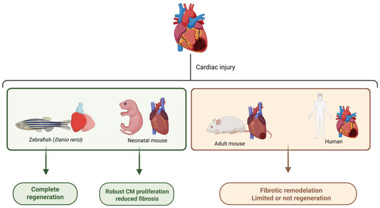 Figure 2. Comparative cardiac regenerative capacity across species. Following cardiac injury, zebrafish (Danio rerio) exhibit complete regeneration, while neonatal mice show robust cardiomyocyte (CM) proliferation with reduced fibrosis. In contrast, adult mice and humans mainly undergo fibrotic remodeling, with limited or absent regenerative responses.