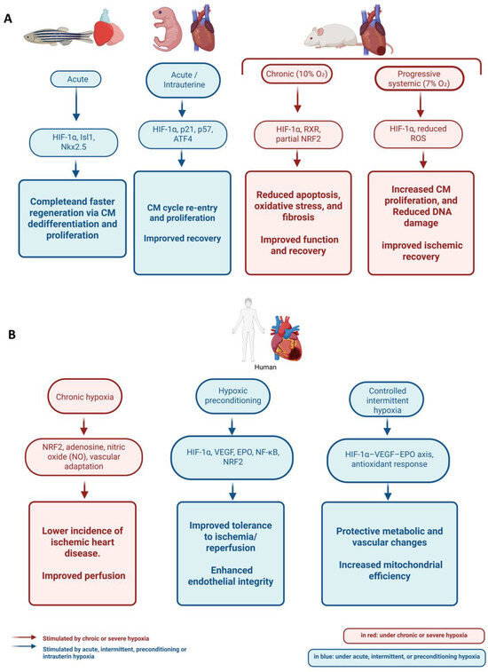 Figure 3. Hypoxia-Induced Cardiac Responses: Regeneration in Experimental Models and Cardioprotection in Humans. (A) illustrates the regenerative capacity in zebrafish (Danio rerio) and neonatal mice. In zebrafish, acute hypoxia triggers cardiomyocyte (CM) proliferation, dedifferentiation, and angiogenesis via hypoxia-inducible factor 1 alpha (HIF-1α), ISL LIM homeobox 1 (Isl1), and NK2 homeobox 5 (Nkx2.5). In neonatal mice, HIF-1α suppresses cell cycle inhibitors, such as p21, p57, and activating transcription factor 4 (ATF4), thereby promoting CM cell-cycle reentry during the early postnatal period. (B) summarizes human cardioprotective adaptations. In high-altitude populations, long-term hypoxia is associated with a reduced cardiovascular risk, mediated by NRF2 activation, nitric oxide (NO) signaling, and adenosine release. In hypoxic preconditioning, transient low oxygen levels enhance ischemia tolerance via HIF-1α, erythropoietin (EPO), nuclear factor kappa B (NF-κB), and NRF2 activation. Controlled intermittent hypoxia stimulates the HIF-1α–VEGF–EPO axis and antioxidant responses, improving metabolic and vascular function as well as mitochondrial efficiency. Collectively, these findings highlight the context-dependent role of hypoxia in either promoting cardiac regeneration or conferring cardioprotection.