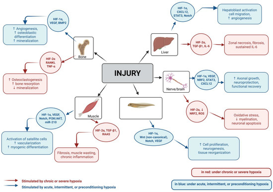 Figure 4. Context-specific effects of hypoxia types on regeneration across multiple tissues. This figure summarizes the differential effects of acute, intermittent, preconditioning, and chronic hypoxia on tissue regeneration. Beneficial responses (blue) include increased vascularization, progenitor activation, metabolic shifts, and tissue remodeling, mediated by HIF-1α, VEGF, Notch, Wnt, PI3K/AKT, STAT3, CXCL12, and NRF2. In structures such as tail, studied in (Xenopus laevis), acute hypoxia promotes early ROS production and HIF-1α stabilization, improving blastema formation, inflammation, and cellular activation. Later stages involve sustained HIF-2α expression, supporting angiogenesis and differentiation. Hypoxia also enhances the expression of genes like notch1, msx1, msx2, cdx4, and fgf10/20, relevant to regeneration. In muscle, acute or intermittent hypoxia supports satellite cell renewal, angiogenesis, and functional recovery, while chronic exposure impairs differentiation and promotes fibrosis. In bone, hypoxia can enhance osteogenesis and vascularization, though under severe or chronic conditions, it reduces mineralization and promotes osteoclast activity. Liver regeneration benefits from VEGF-mediated neovascularization and transient inflammatory activation under hypoxia. In neural tissues, hypoxia-preconditioned cells and extracellular vesicles improve regeneration, axonal growth, and post-ischemic repair. Maladaptive responses (red) include mitochondrial dysfunction, persistent inflammation, fibrosis, and a reduced capacity for repair. These are driven by HIF-2α, TGF-β1, IL-6, and reduced NRF2 activity. In bone, chronic hypoxia and elevated EPO may impair perfusion and promote resorption. Color coding indicates the type of hypoxia: blue arrows denote beneficial responses to acute, intermittent, or preconditioning hypoxia, while red arrows denote the maladaptive effects of chronic hypoxia. These context-specific outcomes demonstrate that hypoxia is neither inherently positive nor negative, but rather exerts tissue- and duration-dependent effects. Collectively, these findings demonstrate how hypoxia affects regenerative processes across various tissues, including cardiac, muscular, and bone repair, as well as vascular remodeling and the regeneration of complex structures. Building on these mechanistic insights, the next section, Section 5, explores how hypoxia is being translated into regenerative medicine, covering preconditioning strategies for stem cells, bioengineering approaches such as extracellular vesicles and hydrogels, and emerging clinical applications designed to enhance tissue repair while emphasizing the need for methodological standardization due to potential risks associated with hypoxic exposure.