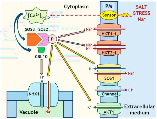 - Gámez-Arjona, F.; Park, H.J.; García, E.; Aman, R.; Villalta, I.; Raddatz, N.; Carranco, R.; Ali, A.; Ali, Z.; Zareen, S.; et al. Inverse regulation of SOS1 and HKT1 protein localization and stability by SOS3/CBL4 in Arabidopsis thaliana. Proc. Natl. Acad. Sci. USA 2024, 121, e2320657121. [Google Scholar] [CrossRef]
