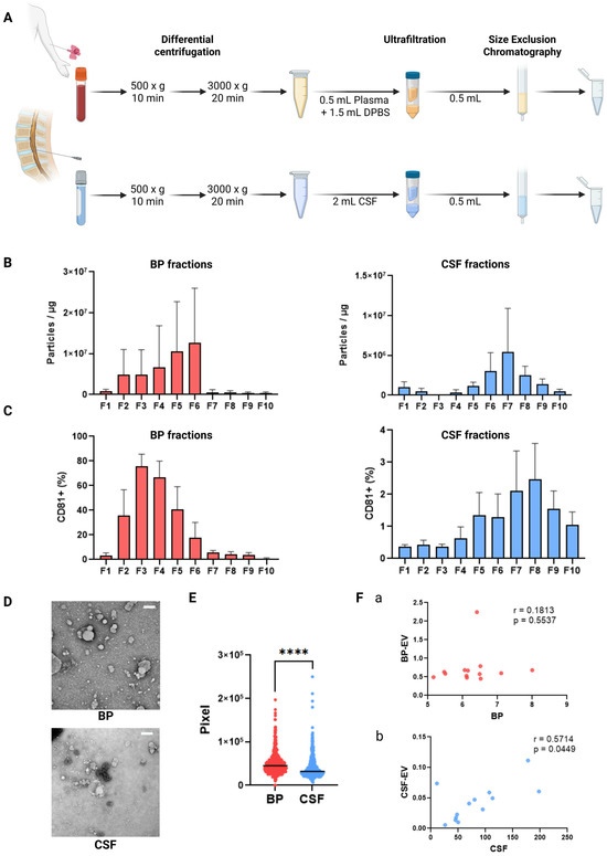 Characterization of particles and small extracellular vesicles (sEVs) from blood plasma (BP) and cerebrospinal fluid (CSF). (A) Schematic workflow of sEV isolation using ultrafiltration–size exclusion chromatography (UF-SEC). (B) Assessment of sEV purity from the ratio of particles per µg protein per fraction of BP and CSF. (C) Mean fluorescence intensity (MFI) of CD81+ objects per fraction from BP and CSF using semi-quantitative bead-based flow cytometry. (D) Representative images of negative staining transmission electron microscopy (NSTEM) of sEV-fractions from BP and CSF. (E) Measurement of the diameter of EV-like objects from BP and CSF (in pixel) from TEM images using the ImageJ software. (F) Correlation analysis between protein concentrations of total proteins and soluble, co-isolated proteins from (a) BP and (b) CSF. **** p < 0.0001.
