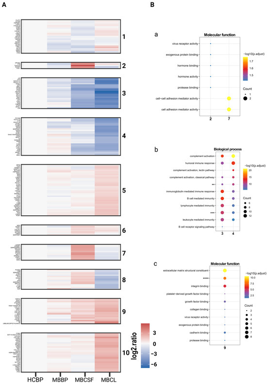 A total of 210 unique proteins were identified and grouped into 10 clusters by K-means clustering (Figure 2A, Supplementary Figures S2–S5 and Table S2). As expected, protein abundance levels of MBBP were most similar to HCBP, while MBCSF and MBBP exhibited distinct protein patterns (Figure 2A, Supplementary Figures S2 and S6–S8). To further explore the function of the enriched proteins, each cluster was then subjected to Gene Ontology (GO) analysis to investigate associated biological processes, cellular compartments, and molecular functions. Clusters with similar patterns (2 & 7, 3 & 4, 5 & 10) were combined for the analysis.