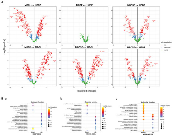 Presentation of differentially regulated proteins between MB-cell lines (MBCL), CSF from patients diagnosed with MB (MBCSF), BP from patients diagnosed with MB (MBBP) and BP from healthy individuals (HCBP). (A) Volcano plots illustrating differential protein level between the conditions. (B) Top 10 molecular functions for proteins differentially regulated between (a) MBCL and MBBP, (b) MBCL and MBCSF and (c) MBBP and MBCSF. * = extracellular matrix structural constituent conferring tensile strength.